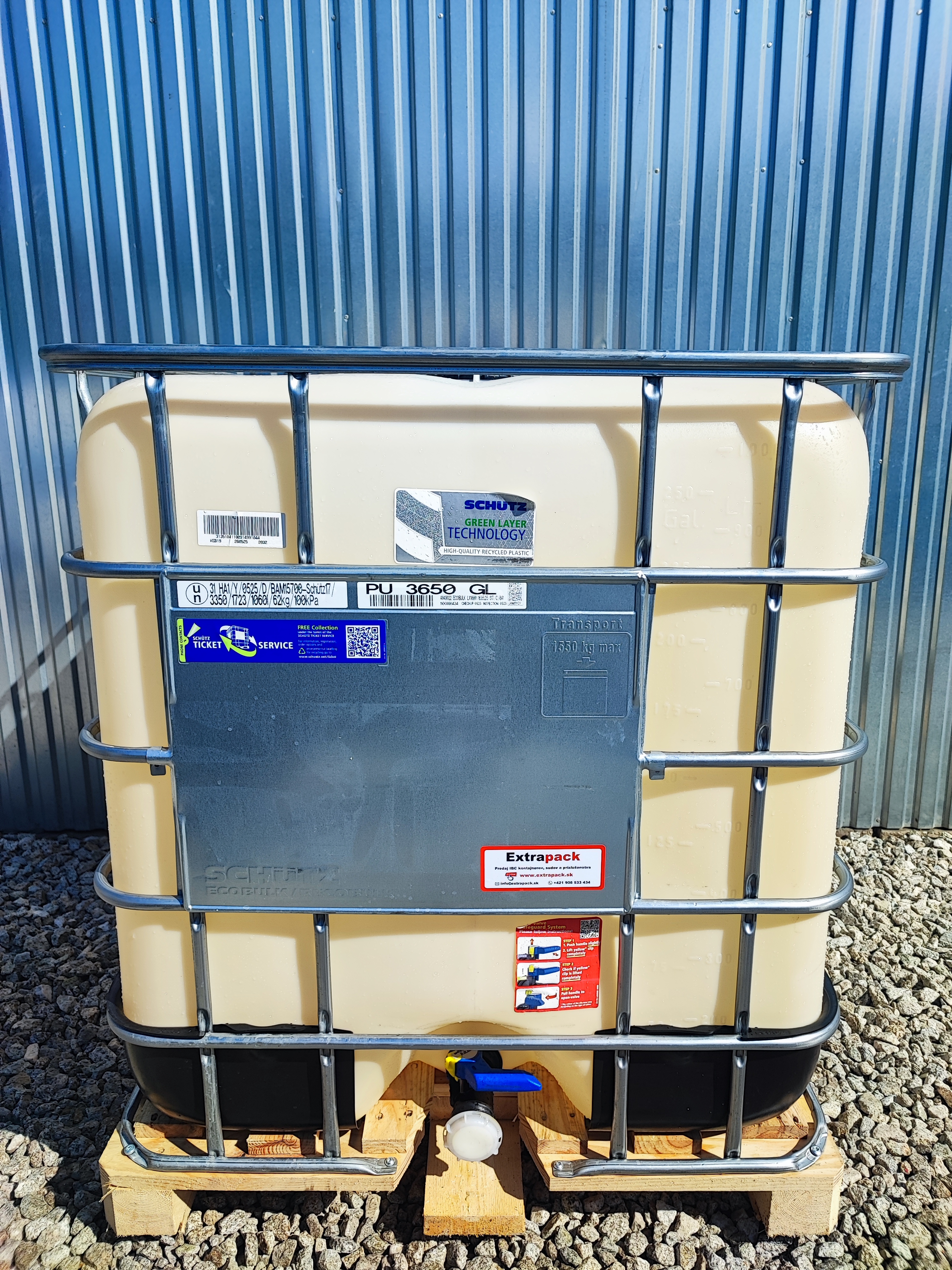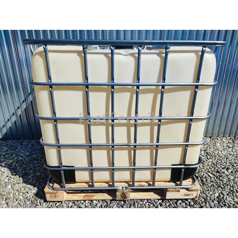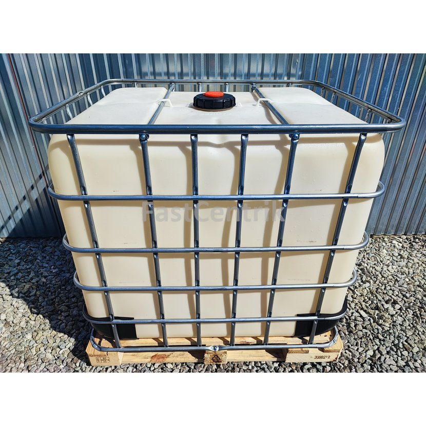 IBC kontajner o objeme 1000 litrov, horný plniaci otvor DN 150 má priemer 15cm a spodný výpustný ventil DN 50 má priemer 5cm. Paleta je plastová, kovová alebo kompozitná ( kombinácia plast/kov ). Rozmery šírka x dĺžka x výška 100cm x 120cm x 120cm, váha 62kg, farba naturálna, biela, čierna, modrá, prípadne iná farba ( podľa aktuálnej skladovej dostupnosti ). IBC kontajner má homologizáciu UN31HA1.